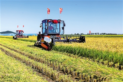 9月3日,在北大荒集团黑龙江江川农场有限公司水稻种植基地,农机手操作农机收割水稻。金秋时节,田间稻穗金黄、瓜果飘香,农民忙着收获劳动的果实。新华社发(王亚光 摄)