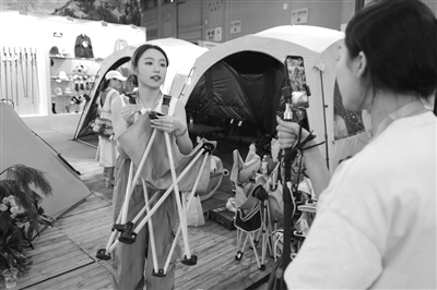 在CLE中国(成都)户外露营生活展上,一名直播达人(左)通过互联网直播销售户外露营产品。