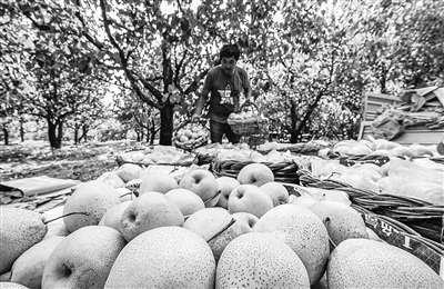 9月18日,河北省遵化市铁厂镇农民在果园搬运采摘的甜梨。金秋时节,瓜果飘香、田野金黄,农民抢抓晴好天气,收获劳动果实。新华社发(刘满仓 摄)