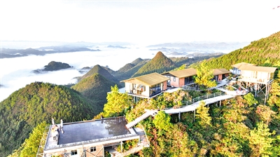 10月24日,游客在贵州省开阳县高寨乡牌坊村一家民宿观赏云海(无人机照片)。近年来,当地通过招商引资、农民入股经营、农村闲置住宅改造等方式,打造特色乡村民宿品牌,大力发展民宿经济,有效带动当地村民就业增收,助推乡村振兴。新华社发(袁福洪 摄)