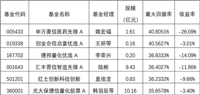 《经济参考报》记者结合多个渠道的公开数据研究发现,截至2024年12月30日,2024年最大回撤率TOP6股票型基金中,平均收益率为-11.35%。其中,收益率最低的为姚宏福管理的申万菱信医药先锋A,亏损26.09%。紧随其后的分别是李荣兴管理的德邦量化优选A亏损14.09%、陆彬管理的汇丰晋信智造先锋A亏损11.86%、盖俊龙管理的红土创新科技创新亏损9.66%、韩羽辰和王卫林、朱剑涛管理的光大保德信量化股票A亏损3.40%、王妍和张荣管理的创金合信启富优选A亏损3.01%。