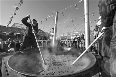 图为工作人员在天津芦台大集上熬制腊八粥。新华社记者 孙凡越 摄