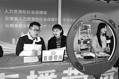 近日,在云南省文山壮族苗族自治州文山市“春风行动”专场招聘会现场,工作人员进行“直播带岗”。春节假期结束,各地举办多场新春招聘活动,吸引众多求职者前来咨询应聘。新华社发(熊平祥 摄)