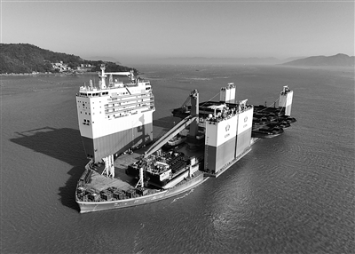 装载13艘船舶的“华瑞龙”半潜船在宁德灶屿水域等待启航(无人机照片)。3月3日,全球第三大半潜船“华瑞龙”在福建宁德灶屿水域装载13艘船舶启航前往非洲几内亚。本次装载的13艘船舶预计将于四月中旬运抵目的地。新华社记者 林善传 摄