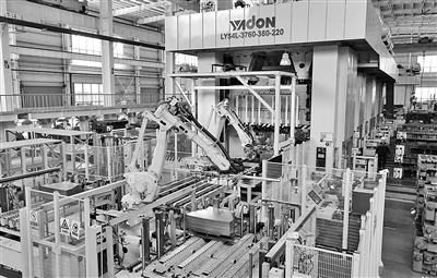 3月31日,在位于肥西县的安徽瑞山汽车零部件有限公司车间内,机械臂在进行全自动冲压作业。