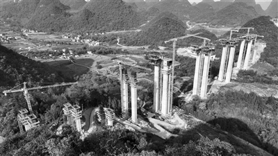 暖春时节,在广西融安县泗顶镇融福高速公路建设工地,中建二局的建设者紧抓有利的天气条件,大力推进项目施工。图为工人在融福高速公路广西融安县泗顶镇桐木河特大桥建设工地施工作业(无人机照片)。新华社记者 黄孝邦 摄