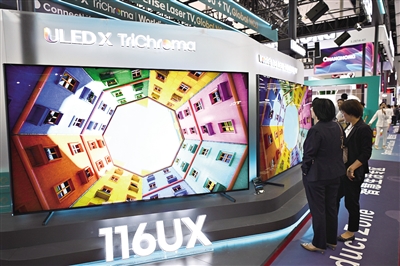在第137届广交会上,各类融合绿色创新理念的“智造”产品备受外商青睐。图为本届广交会的智慧生活专区,观众在观看大尺寸电视产品。记者 邓华 摄