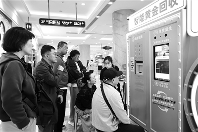 5月5日,在上海市普陀区一家商场内的“智慧金店”,人们观看黄金回收设备运行情况。“智慧金店”包含“智能黄金回收”和“自助黄金购买”功能,“智能黄金回收”系统具备自助下单、自动检测、快速回款等功能,系统可自动检测用户放入的黄金重量和纯度,根据实时金价计算回收金额并迅速打款,成为黄金回收领域的一项新探索。新华社记者 王翔 摄