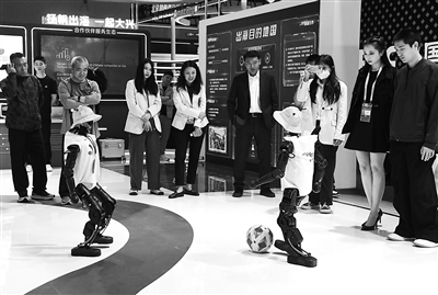5月8日,机器人在第二十七届中国北京国际科技产业博览会大兴展台展示踢足球。 5月8日至11日,以“科技引领 创享未来”为主题的第二十七届中国北京国际科技产业博览会(简称北京科博会)在国家会议中心举办。据了解,本届北京科博会设有信息科技、智能制造、医药健康、绿色双碳、数字经济和区域创新6个专题展区,展览总面积约5万平方米,吸引800余家中外企业和机构参展。新华社记者 任超 摄