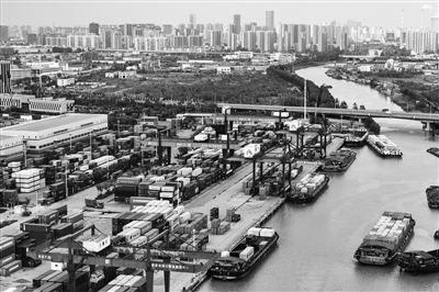 图为货船在位于京杭大运河淮安段的淮安港装货(无人机照片)。新华社发 (徐昌政 摄)