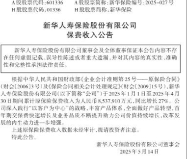 新华人寿保险股份有限公司保费收入公告