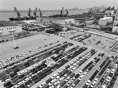 5月13日,在江苏省连云港港东方港务分公司码头,大批轿车集港准备装船出口(无人机照片)。