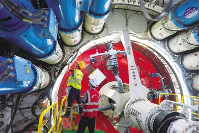 6月5日,中铁十一局技术人员在甬舟铁路金塘海底隧道“定海号”盾构机内关注设备运行情况。当日,在甬舟铁路金塘海底隧道舟山侧海平面下约60米深处,“定海号”盾构机掘进里程突破3135米,标志着长6270米的金塘海底隧道舟山侧盾构施工完成过半,工程建设取得新进展。甬舟铁路金塘海底隧道西起浙江宁波市北仑区,东至舟山市金塘镇,全长16.18公里,是世界最长海底高铁隧道。新华社记者 黄宗治 摄
