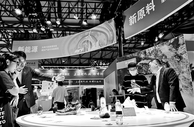 6月5日,工作人员在一组新材料应用产品展示台前向参观者做介绍。当日,以“走向碳中和之路”为主题的2025上海国际碳中和技术、产品与成果博览会在上海新国际博览中心开幕。本届博览会围绕“应用驱动绿色转型”,由主题展览、系列论坛、贸易对接三大板块构成,来自德国、荷兰、日本、英国等15个国家和地区的逾300家行业企业全方位展示全球碳中和领域的前沿成果与实践。新华社记者 方喆 摄