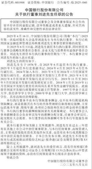 中国银行股份有限公司关于执行董事刘进先生任职的公告