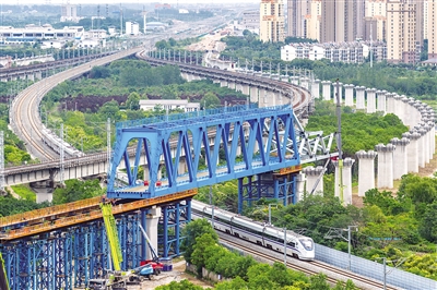 新建沪宁合高铁钢桁梁跨越沪蓉铁路(6月15日摄,无人机照片)。6月15日凌晨,由中铁四局承建的新建上海至南京至合肥高铁重达近千吨的钢桁梁成功跨越沪蓉铁路,为后续架梁施工奠定基础。据悉,新建上海至南京至合肥高速铁路是国家中长期铁路网规划“八纵八横”中沿江通道的重要组成部分,是江北沿江城市与南京都市圈、上海都市圈快速直达的快捷通道。新华社发(刘玉才 摄)