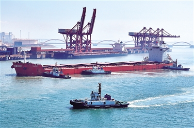 近日,轮船在拖轮的协助下向唐山港曹妃甸港区矿石码头靠泊(无人机照片)。记者从河北省唐山市海洋口岸和港航管理局获悉,今年1至6月份,唐山港全港完成货物吞吐量43356万吨,同比增长0.75%。新华社记者 杨世尧 摄