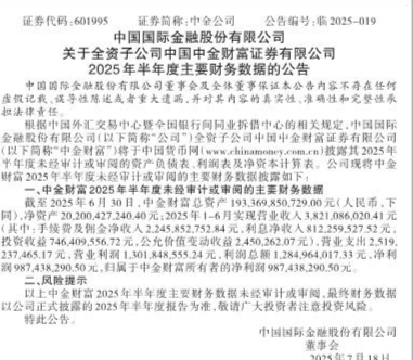 中国国际金融股份有限公司关于全资子公司中国中金财富证券有限公司2025年半年度主要财务数据的公告