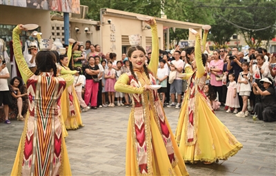 图为演艺人员在新疆库车市龟兹小巷为游客表演顶碗舞。