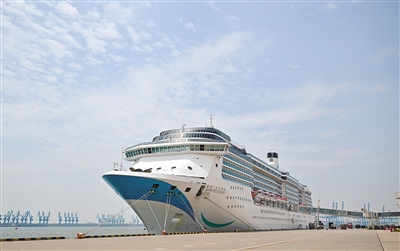 7月23日,“爱达·地中海”号国际邮轮搭载着约1600名旅客缓缓靠泊天津国际邮轮母港,随后搭载1500余名旅客开启六天五晚的邮轮游。记者从天津边检总站东疆边检站了解到,今年7月以来,天津邮轮口岸累计查验出入境人员近4万人次,邮轮16艘次,较去年同期均增长了17%。图为拍摄的靠泊在天津国际邮轮母港的“爱达·地中海”号国际邮轮。新华社记者 孙凡越 摄