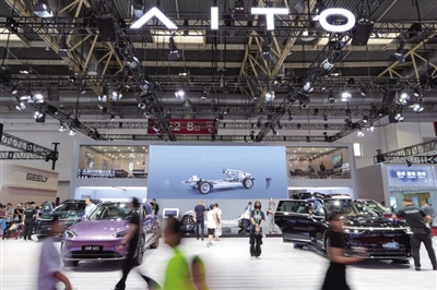 近日,在第三届中国国际供应链促进博览会设置的智能汽车链展区问界展台,参观者在参观展出的新能源汽车整车产品。新华社记者 鞠焕宗 摄