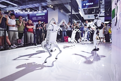 7月27日,中国移动自研机器狗及机器人在进行舞蹈表演,吸引参观者驻足。正在上海举行的2025世界人工智能大会展览现场,参观者与能分拣物品打扫房间的机器人、具备拍摄导航语音翻译功能的智能眼镜、AI艺术创作系统、基于AI大模型打造的驾驶座舱等众多AI科技前沿产品零距离互动,仿佛置身未来世界,感受科技之美。新华社记者 陈浩明 摄