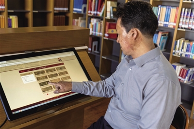 图为西藏自治区图书馆副馆长边巴次仁在介绍数据库中的藏文古籍。新华社记者 旦增尼玛曲珠 摄