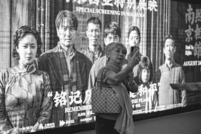中国电影《南京照相馆》近日在马来西亚首都吉隆坡举行首映礼,这部以南京大屠杀为历史背景的电影深深触动了观众。图为吉隆坡一名观众观影后同《南京照相馆》海报合影留念。新华社记者 程一恒 摄