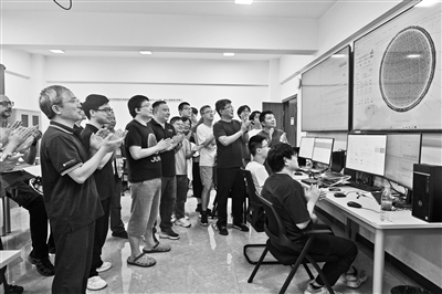8月26日,科研人员在江门中微子实验运行控制室共同开启物理取数,鼓掌庆祝取数成功。当日,江门中微子实验(JUNO)成功完成2万吨液体闪烁体灌注,并正式运行取数。经过十余年准备和建设,江门中微子实验成为国际上首个运行的超大规模和超高精度中微子专用大科学装置。新华社发(刘悦湘 摄)