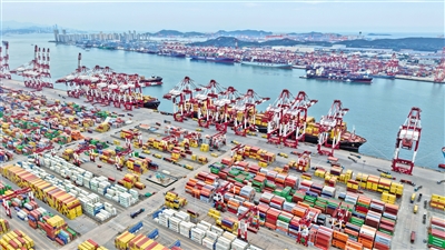8月26日拍摄的山东港口青岛港前湾港区(无人机照片)。近年来,山东港口青岛港依托青岛区位优势以及青岛上合示范区集聚辐射效应,积极服务和保障上合组织国家海上经贸往来。截至目前,青岛港共挂靠上合组织国家航线42条,通达上合组织国家的30多个港口,实现了货物吞吐量、新航线开辟“双增长”。新华社记者 李紫恒 摄