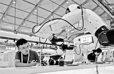 9月10日至9月13日,2025Inclusion·外滩大会在上海黄浦世博园区举行。图为参观者观看机器人演示饮品服务。记者 方喆 摄