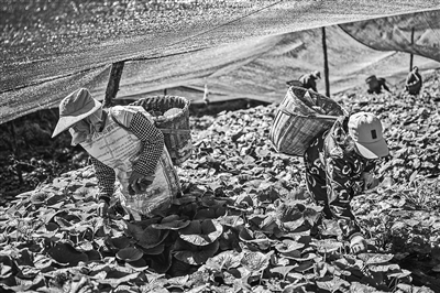 11月17日,农民在云南省保山市隆阳区杨柳白族彝族乡冷水村一处山葵种植基地内采摘山葵。云南省保山市地处高黎贡山区域,当地自然条件适宜山葵生长。近年来,当地政府着力推进山葵标准化、规模化种植,为山区创造产业发展机遇,助力农民增收。目前,保山市已成为国内最大的山葵种植区,产品在国内市场销售份额逐年上涨,还出口至日本、韩国及东南亚国家,发展前景广阔。新华社记者 王冠森 摄