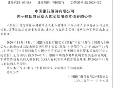 中国银行股份有限公司关于赎回减记型无固定期限资本债券的公告