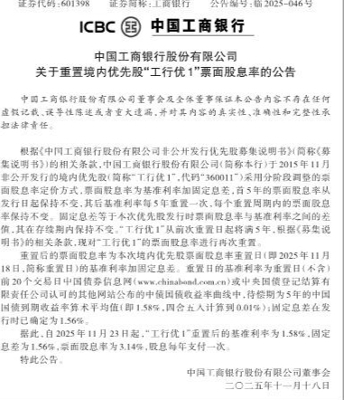 中国工商银行股份有限公司关于重置境内优先股“工行优1”票面股息率的公告