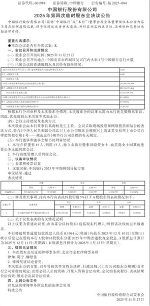 中国银行股份有限公司2025年第四次临时股东会决议公告