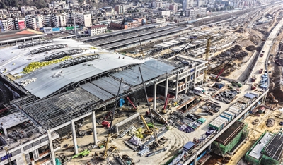 日前,安顺至六盘水高速铁路六盘水站站房及站场改造工程在稳步推进中。由中铁电气化局承建的六盘水站站房钢网架提升工程顺利完成,站房内部施工及相关配套设施正在建设中。图为12月11日拍摄的六盘水站站房及站场改造工程施工现场(无人机照片)。新华社记者 陶亮 摄