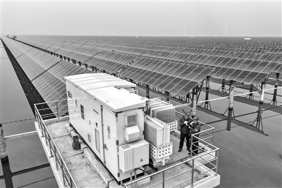 12月10日,国网沧州供电公司的工人在辖区渤海新区黄骅市一处“渔光互补”光伏发电场巡检(无人机照片)。据国网沧州供电公司介绍,目前该市风电、光伏发电等清洁能源装机容量达到1010.7万千瓦,占统调总装机容量的62.14%。新华社记者 杨世尧 摄