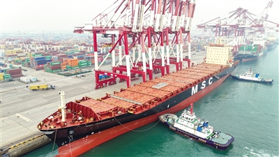 图为澳洲直航新航线首班船舶——“地中海杰西尼亚”轮靠泊山东港口青岛港(无人机照片)。新华社发(张进刚 摄)