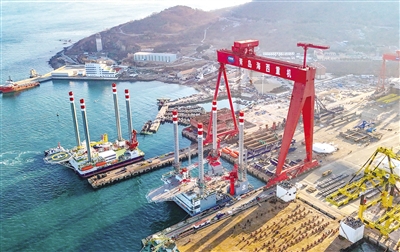1月22日,由中船武汉船机海西重机自主设计建造的两座新一代“海上移动岛”——TYPE3 PRO型自升式海上作业支持平台,从青岛西海岸新区启航,发往中东波斯湾海域交付。该型平台集作业高效、绿色环保与网络安全等先进性能于一身。新华社发(张进刚 摄)