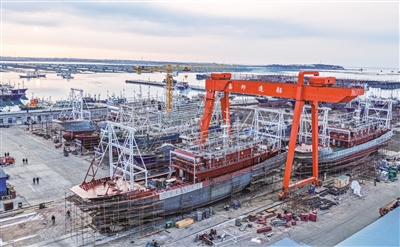 1月28日,在山东省荣成市石岛管理区海工装备产业基地,船舶在维修中(无人机照片)。