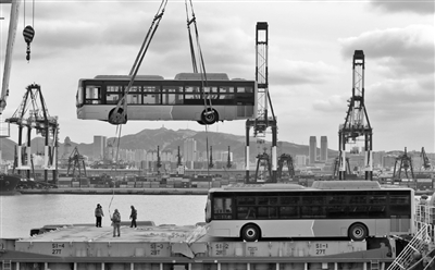 近日,100台出口墨西哥的天然气公交车在山东港口烟台港完成装船并启程。这批天然气公交车是安凯客车基于墨西哥市场需求研发的定制化产品,拥有更低气耗、更强动力和更长续航,将投入到墨西哥蒙特雷市的公共交通系统。图为出口墨西哥的天然气公交车在山东港口烟台港装船(无人机照片)。新华社发(唐克 摄)