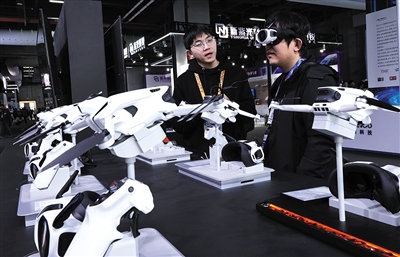 图为参观者(右)在东方枢纽展区现场佩戴智能眼罩体验全景飞行器视角。新华社记者 方喆 摄