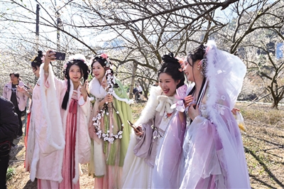 1月10日,2026中国·永泰第十二届梅花季在葛岭镇溪洋村启动。现场还举办了风物雅集,展销青梅酒、李干、柿饼等当地特产,配套汉服巡游、古筝演奏等演出活动,让游客在花海中感受“梅韵”与“乡愁”的交融。赏花热潮不仅激活了溪洋村的餐饮、住宿、交通等关联产业,更催生了“花+美食”“花+研学”“花+露营”等新业态,上演了“颜值”变“产值”的生动实践。