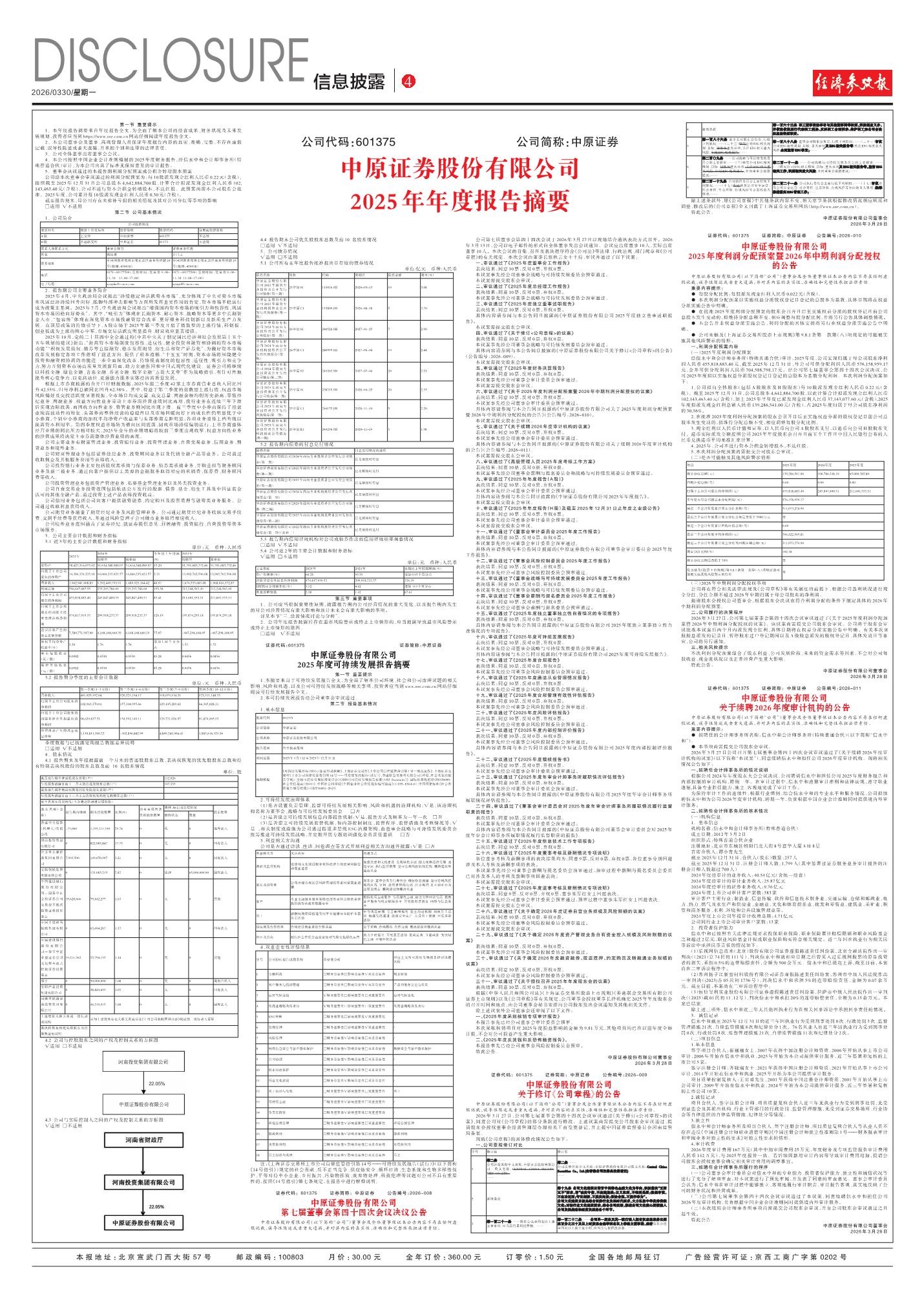 中原证券股份有限公司2025年年度报告摘要