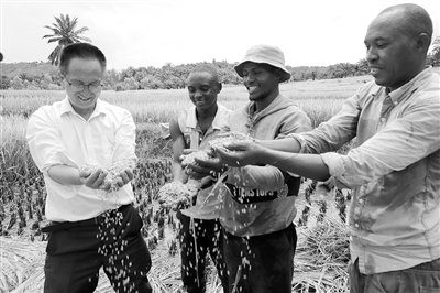 图为在布隆迪布琼布拉省姆潘达县,中国援布农业专家组组长杨华德(左一)和当地农业技术员麦乐斯(右一)、附近农户们查看稻粒。新华社记者 鞠银河 摄