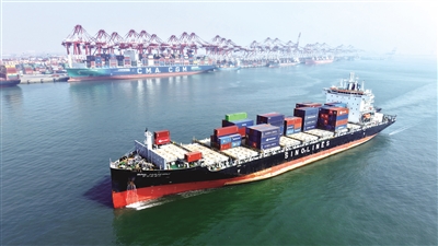 4月1日,在山东港口青岛港,一艘装载集装箱的货轮驶入港口(无人机照片)。2026年第一季度山东港口青岛港新开通7条集装箱航线。至此,青岛港一季度新开通航线已覆盖东南亚、澳大利亚、非洲、中南美等区域。新华社发(俞方平 摄)