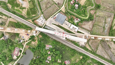 图为4月21日拍摄的合武高铁跨宁西铁路万吨连续梁转体施工现场(无人机照片)。新华社记者 周牧 摄