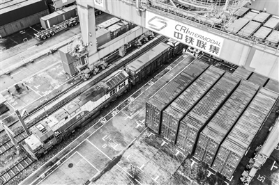 图为4月21日,西部陆海新通道班列在重庆团结村站等待发车(无人机照片)。新华社记者 唐奕 摄
